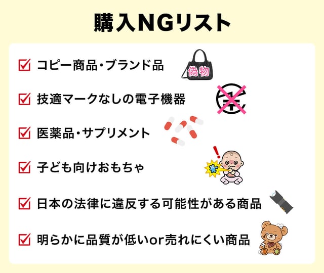 こうした商品を知らずに仕入れてしまうと、税関で没収されたり、最悪の場合は法的な処分を受けるリスクもあります。法律に違反する可能性のある商品は、仕入れないように注意しましょう。