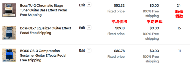 eBayでも高い人気を誇り、定番といわれる「TU-2 クロマティックチューナー」や魅力的な音作りを可能にする「GE-7 イコライザー」「CS-3 コンプレッサー・サスティナー」などが人気商品となっています。