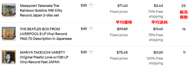 検索1位のワードは「vinyl records」で、アナログレコードを意味します。日本から出品された商品の中で売れている商品TOP3は、以下のようになっていました。