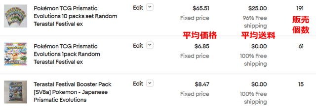 BOXやパックのトレカになると、「prismatic evolutions」が最も検索されています。未開封で絞り込んでみた場合、売れ筋TOP3は以下のようになりました。
