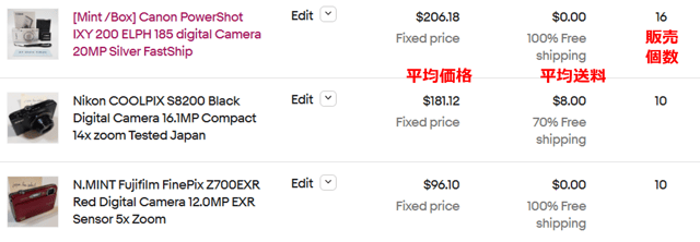 デジカメはメルカリやヤフオクでも需要がありますが、eBayの方が高額で売れる傾向です。このカテゴリーでは「digital camera」というキーワードで検索する人が最も多く、中古品で絞り込むと以下の3つの商品がよく売れています。