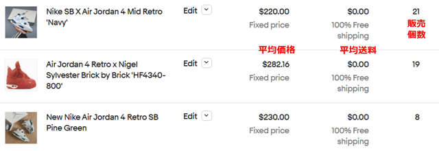 検索1位のワード「jordan 4」で実際に売れた商品TOP3は、以下のとおりです。検索条件では、「新品(箱入り)」を設定しています。