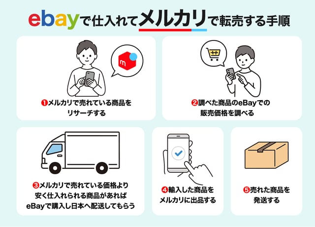 - メルカリで売れている価格より安く仕入れられる商品があればeBayで購入し日本へ配送してもらう