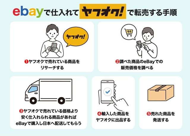 - ヤフオクで売れている価格より安く仕入れられる商品があればeBayで購入し日本へ配送してもらう