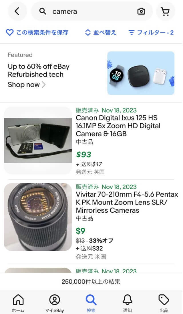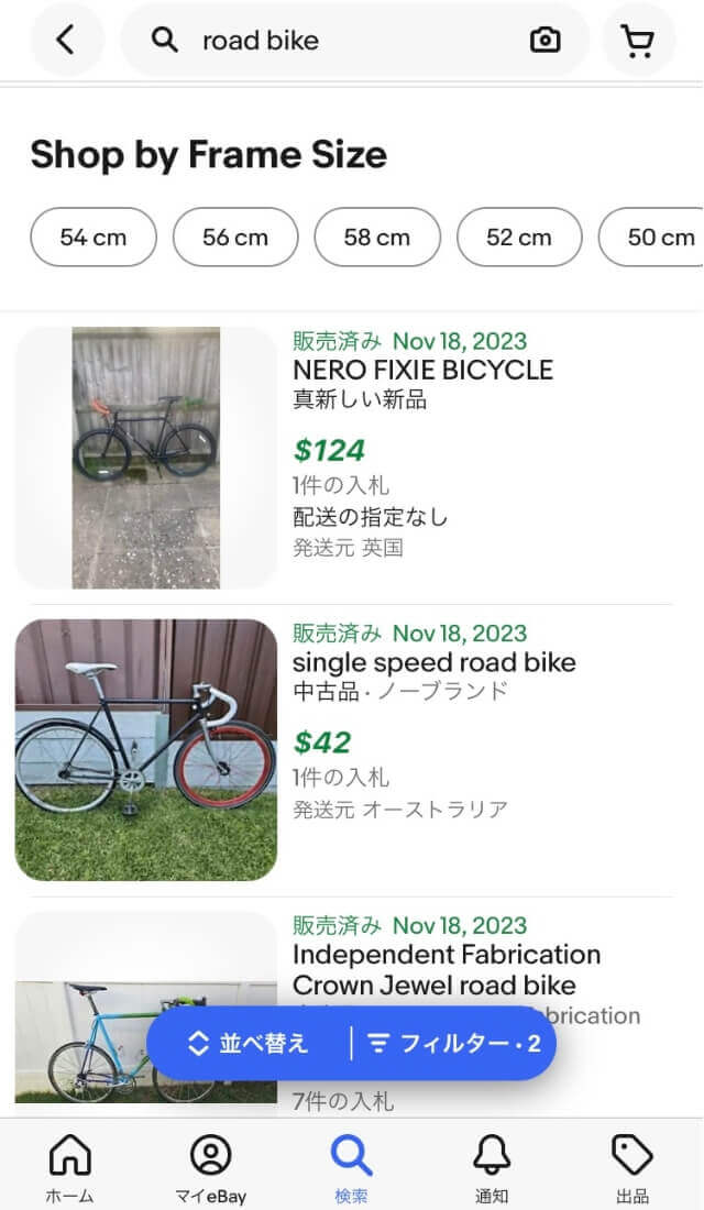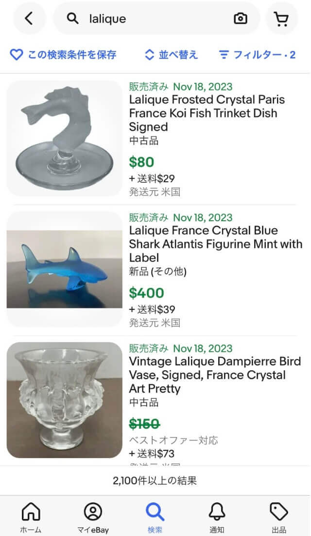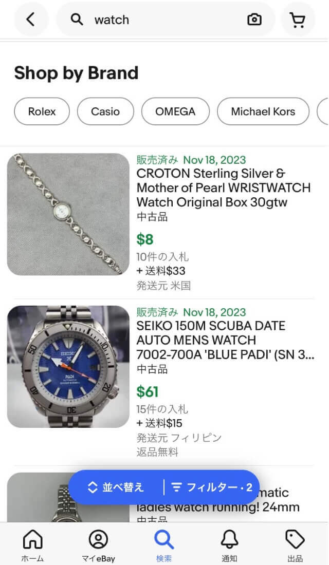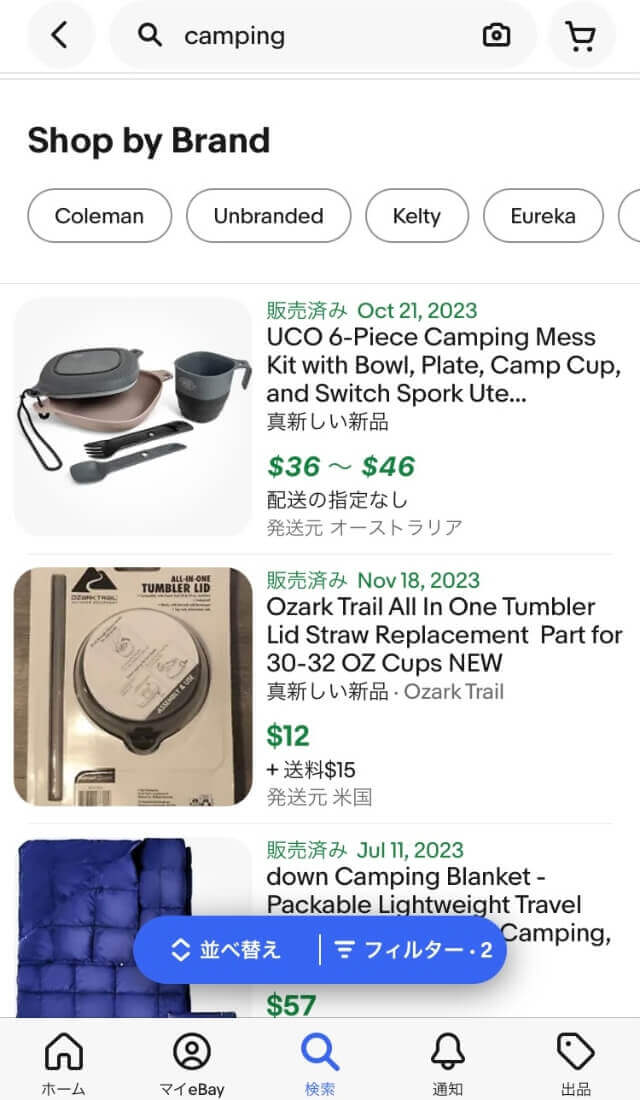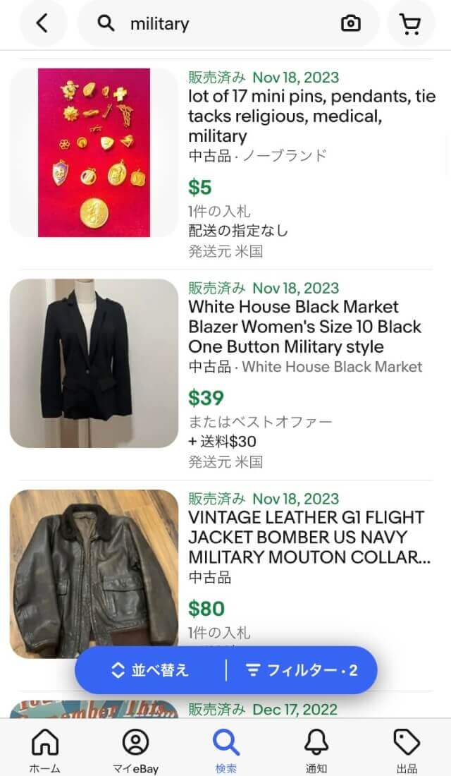 eBayでは商品名を英語に訳して検索してください。さらに「sold items」で絞り込むと購入金額の目安がわかり、利益を計算しやすくなります。