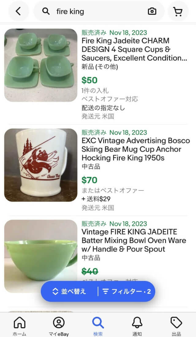 eBayの検索では「fire king」に「マグ(mug)」や「ジェダイ(Jade-ite)」など種類やシリーズ名を加えて絞り込むと利益商品が見つけやすいです。