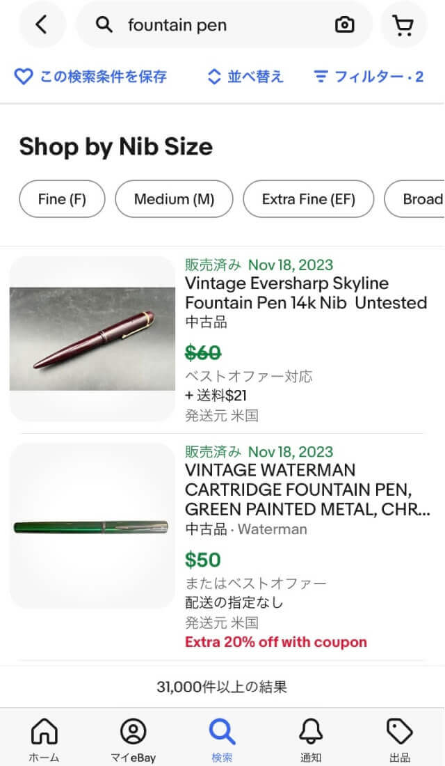 万年筆は出品数が多いため、「fountain pen」に「Pelikan」などのブランド名やモデル名で探すと絞り込みやすいでしょう。