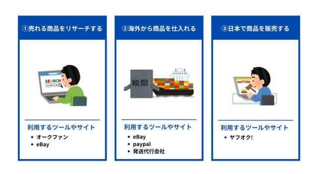 海外から仕入れた商品を日本で販売して儲けるビジネスのことです。eBayで輸入してヤフオク!やメルカリで転売する場合も、輸入販売ビジネスにあたります。