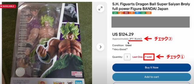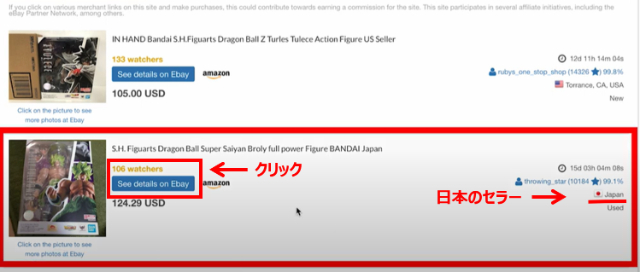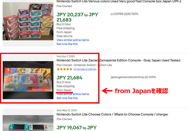今回は、真ん中の赤枠の商品を調べてみましょう。このとき、「from Japan」となっていることを必ず確認してください。