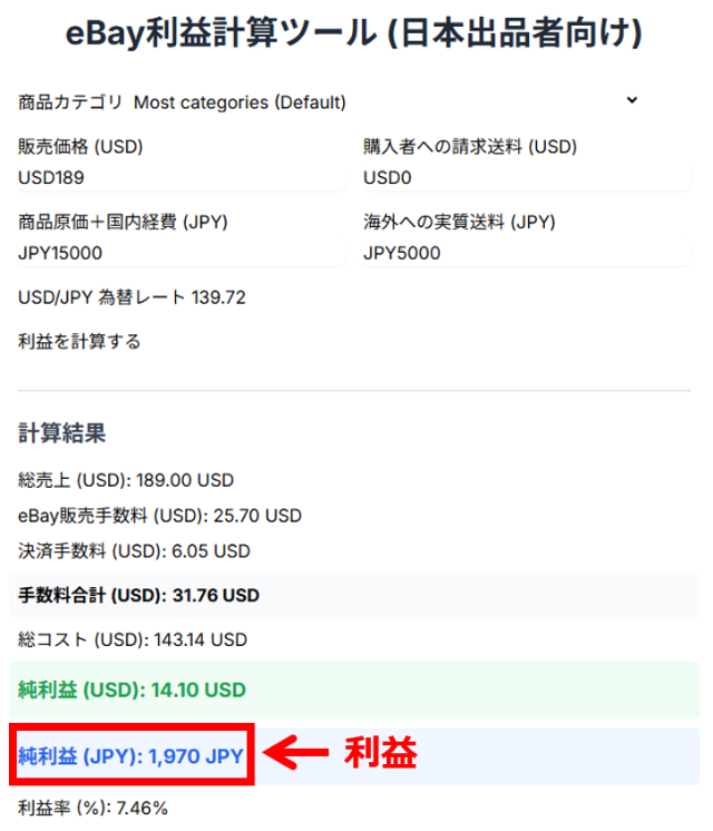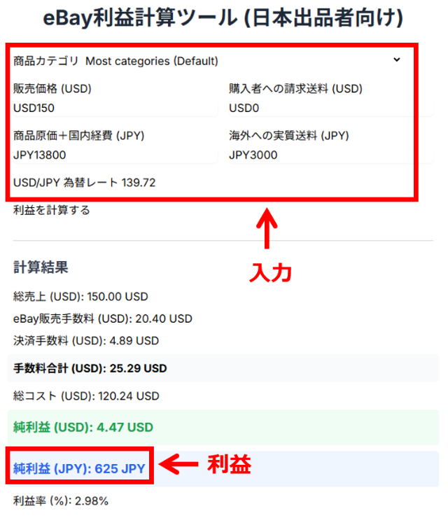 これは、eBayで150ドル(日本円で約2万円)で出品したとして、送料が3,000円で済んだ場合の利益計算結果です。これなら、625円の利益が出ますね(※為替レート139.72円で計算)。