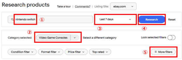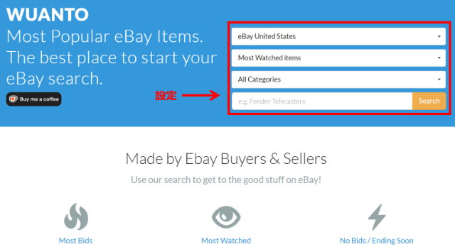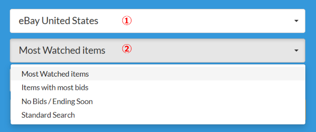2つめの項目は「Most Wanted items」を選択してください(②)。これで、eBayで最も見られている商品を見つけられます。