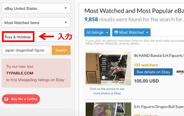 左側にある項目で、最初に「All Categories」としていた部分を該当カテゴリーで絞り込んでみましょう。今回は「Toys & Hobbies」にしました。