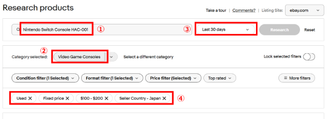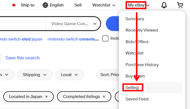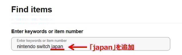 まずは、一番上のキーワード「nintendo switch」に「japan」を追加します。こうすることで、日本から出品されている商品がヒットしやすくなります。
