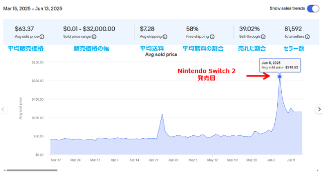 今回は、先日「2」が発売されたばかりのタイミングなので、「nintendo switch」で検索してみました。おそらく、市場がすごく動いてるはずです!