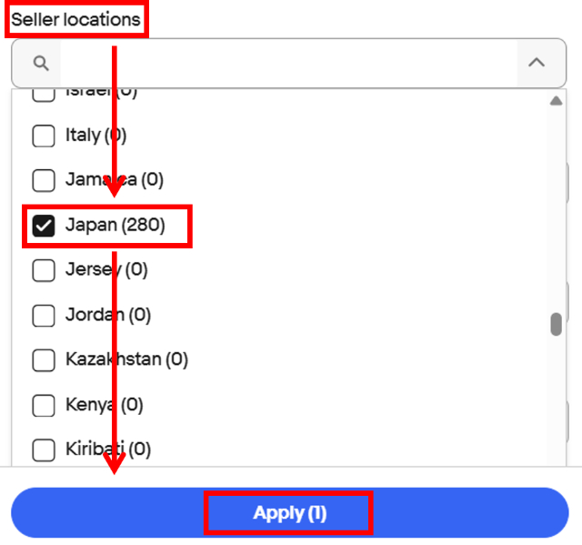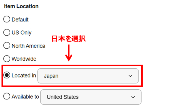 続いて「Item Location」のところで「Located in Japan」を選択しましょう。これで、日本から出品されている商品がヒットします。