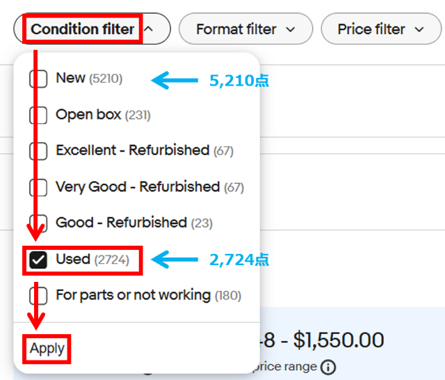 その下の「Buying Format」は「Buy It Now」と「Used」にチェックを入れます。定額出品は相場をつかみやすく、中古品は利益を取りやすいからです。