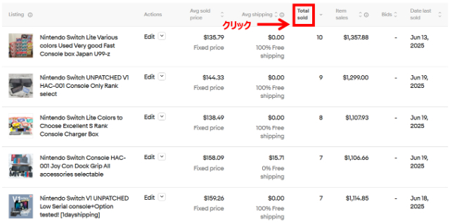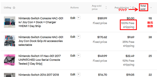 おすすめは、「Total sold」をクリックすることです。こうすると、売れた個数が多い順にソートがかけられます。