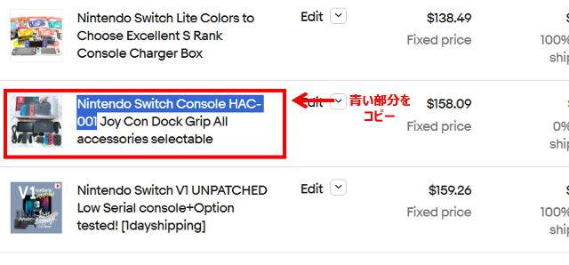 ①検索窓にコピーした「Nintendo Switch Console HAC-001」を貼りつける