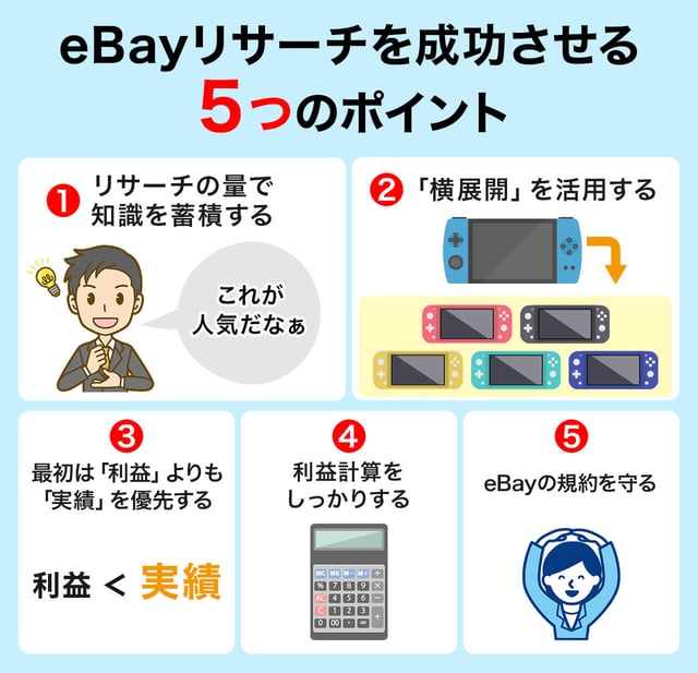 今回解説した手順や知識を網羅できれば、eBayのリサーチはバッチリです。ここでは、プラスαの情報としてリサーチを成功させるポイントを5つ紹介します。