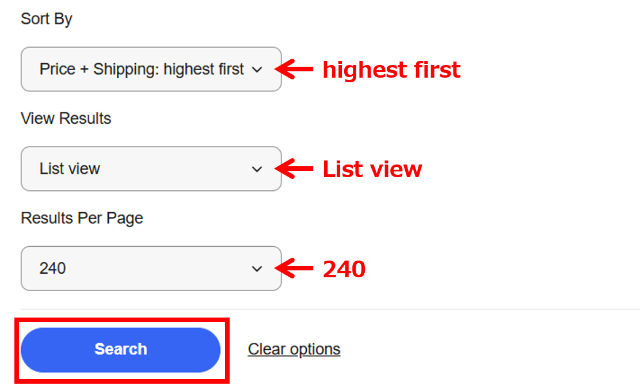 「highest first」は、検索結果を価格が高い順に並べるための設定です。こうすることで、価格差の取りやすい商品を探しやすくなります。List viewと240は、検索結果を見やすくするための設定です。