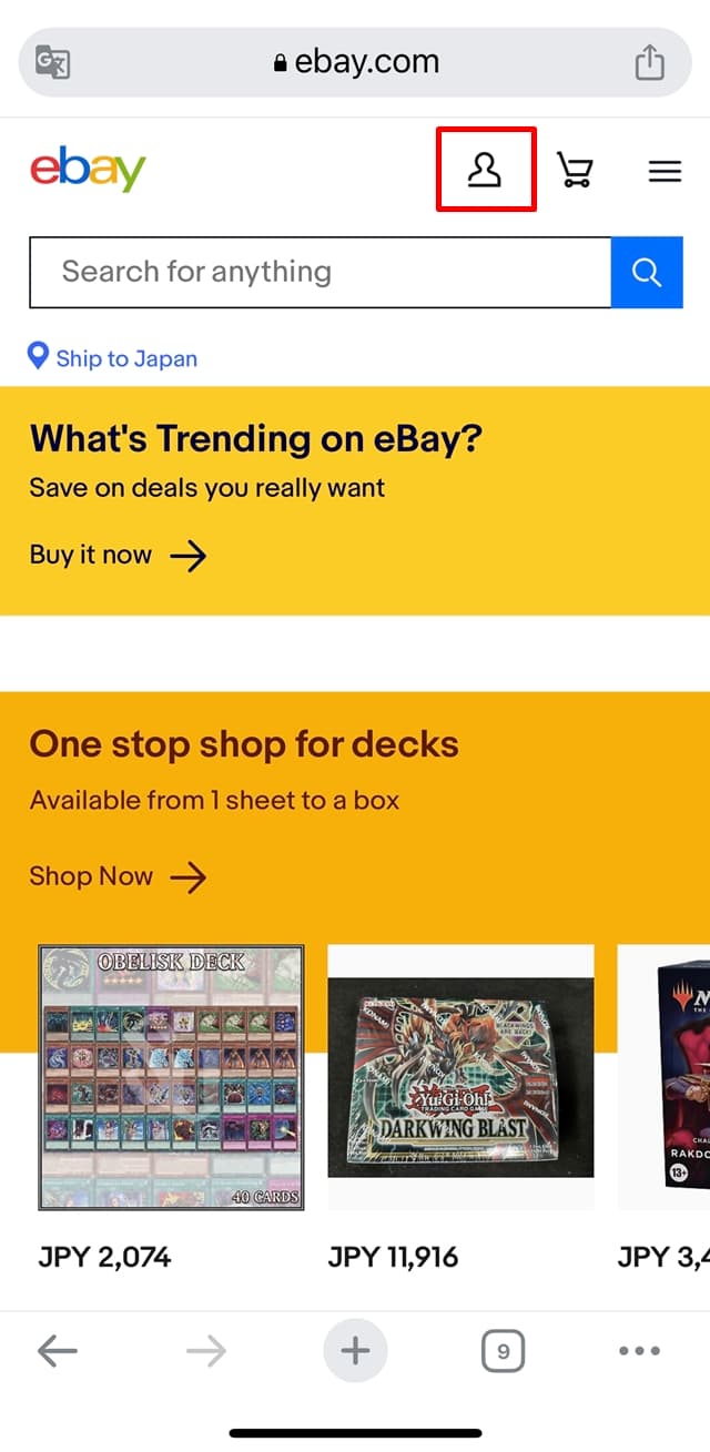 eBayにアクセスし、画面上の人型アイコンをタップ。