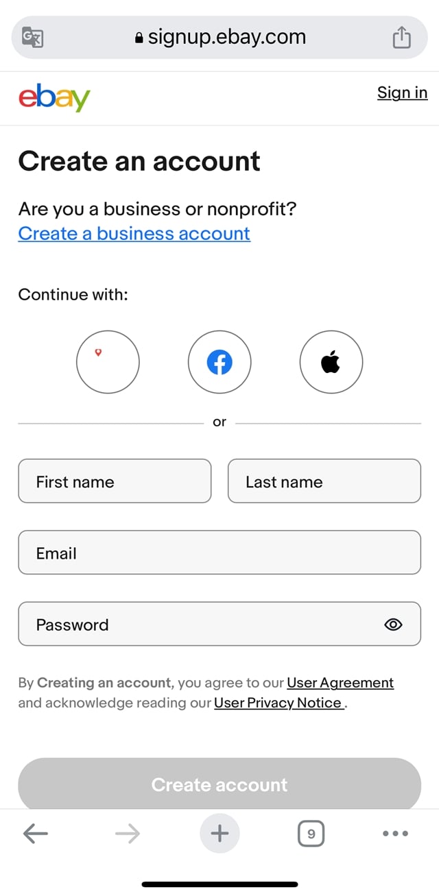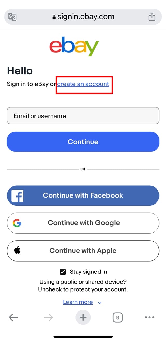 表示された画面で「Hello」の下に表示されている「Sign in to eBay or create an account」の「create an account(アカウント作成)」という青文字部分をタップします。