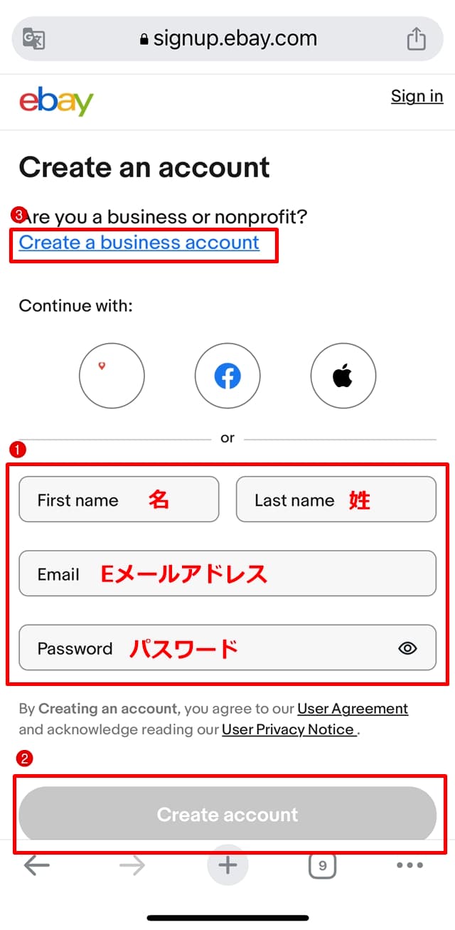 メールアドレスと任意のパスワードを設定し、②の「Create account(アカウント作成)」をタップすれば、eBayアカウントの作成完了です。ビジネスアカウントを作成する場合は、ここではなく③[Create a business account(ビジネスアカウントを作成)]で手続きしてください。