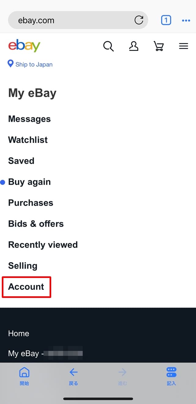 「My eBay」の画面で、[Account(アカウント)]をタップ。
