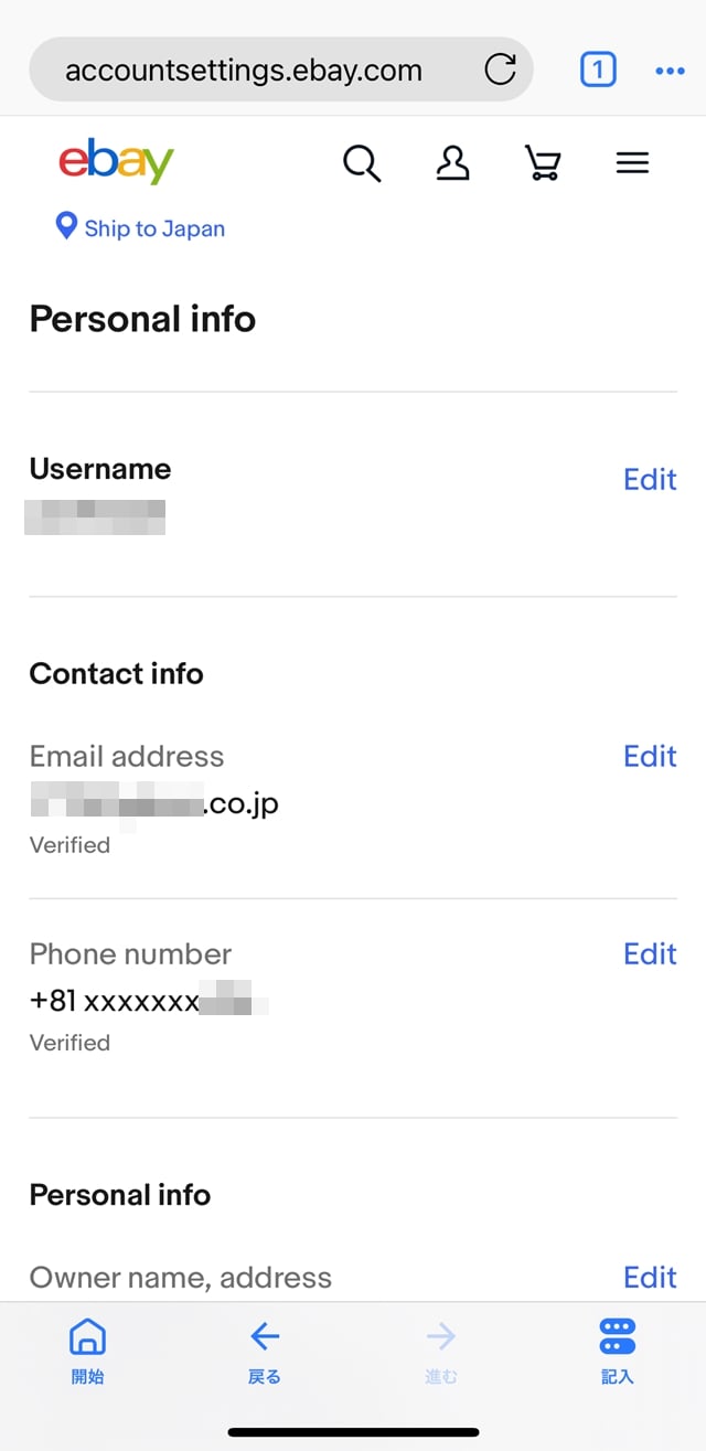 画面を下にスクロールすると、以下のとおり①「Owner name,address(オーナー名、住所)」の欄があるので、②[Edit]をタップすれば、住所の登録や変更が行なえます。