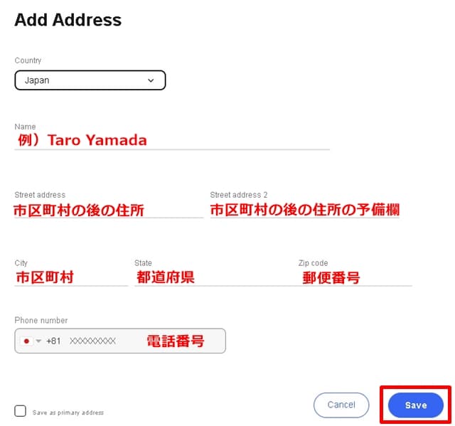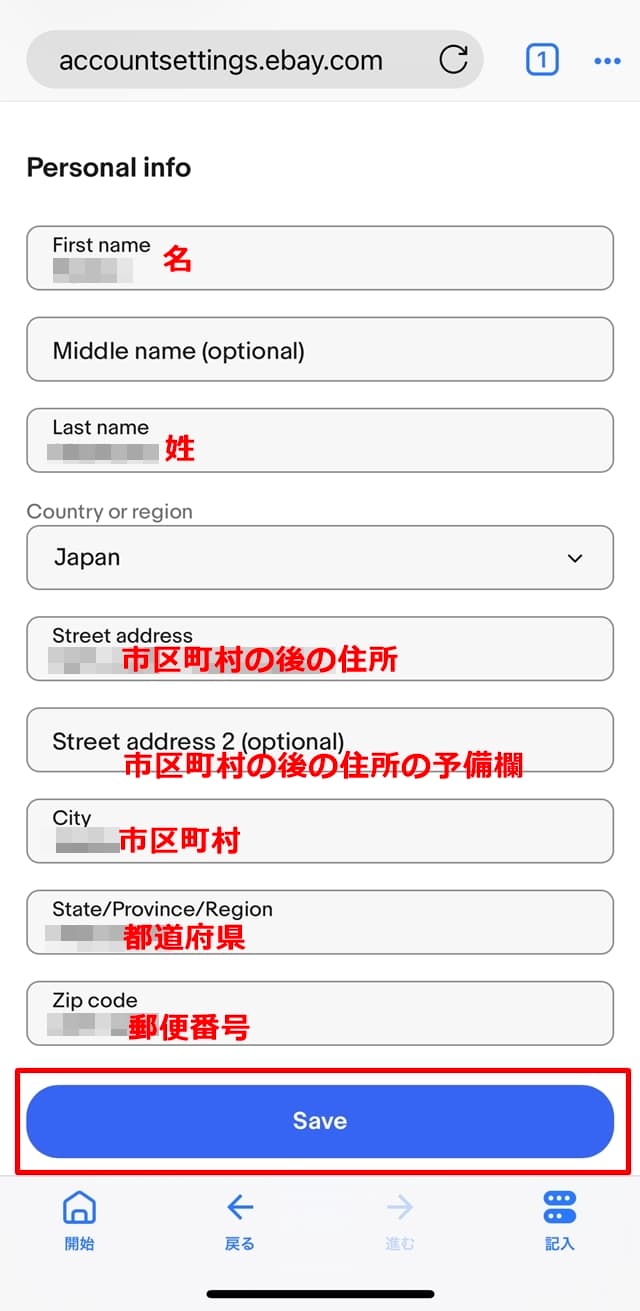以下がeBayで住所を登録または変更する画面です。以下の欄で名前と住所を入力し、「Country or region(国または地域)」の欄では「Japan」を選択し、[Save(保存)]をタップすれば登録完了です。