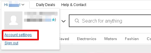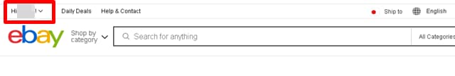 eBayトップページで、画面右上の「Hi ◯◯(アカウント名)!」の部分をクリック。
