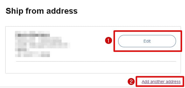 「Ship from address」の画面で、既に設定されている住所を編集する場合は①の[Edit(編集)]を、新たに配送先住所を追加する場合は②の[Add another address(ほかの住所を追加)]をクリック。