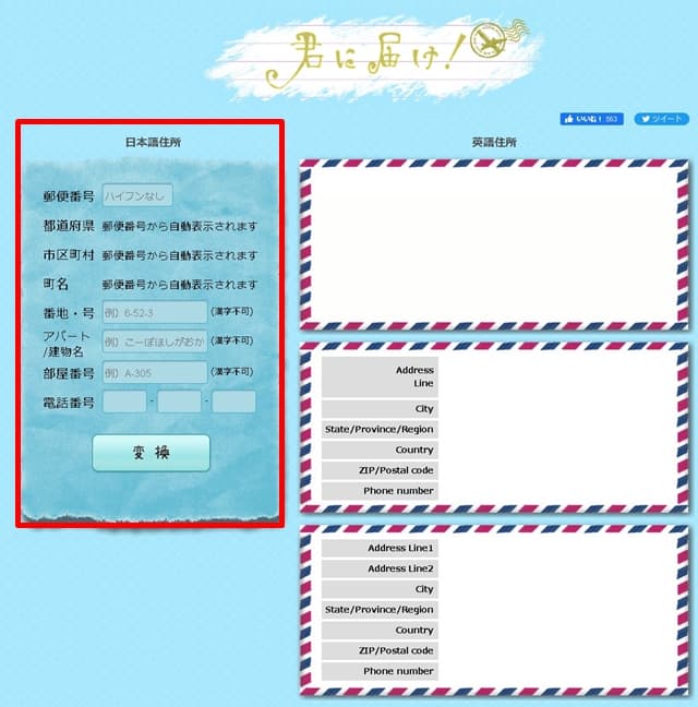 以下の画面で日本語の住所を入力して[変換]ボタンをクリックすれば、英語住所が表示されます。
