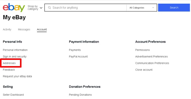 eBayトップ画面の「Hi 〇〇(アカウント名)!」から「Account settings(アカウント設定)」に進み、「Addresses(住所)」メニューをクリックすれば、各種住所の変更ができます。