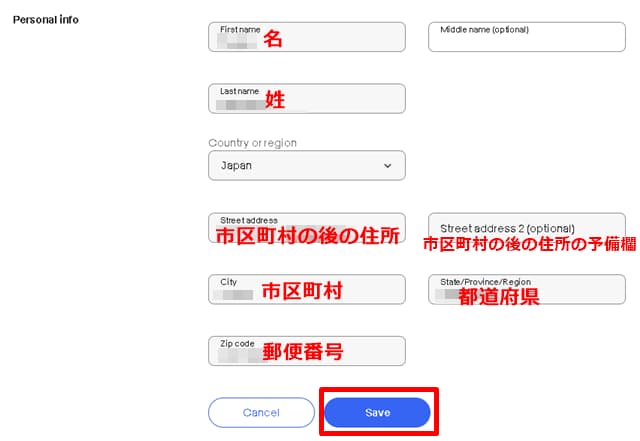 「Personal info(個人情報)」の入力欄が表示されるので、該当欄を登録・変更し、「Country or region(国または地域)」の欄では「Japan」を選択。「Save(保存)」をクリックすれば、登録・変更完了です。