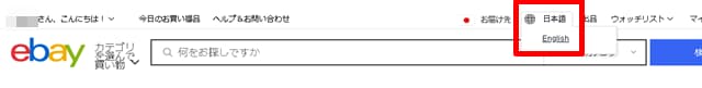 パソコン画面の場合は、eBayトップ画面の検索窓の上にある地球のアイコン部分をクリックして、「English」をクリックすれば日本語から英語に切り替わります。