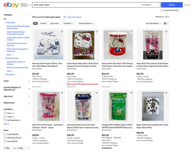 一般的な商品であっても、「日本ならでは」の価値がついたものは、売れる可能性があります。たとえばキティちゃんのトイレットペーパーは、4ロールで30ドル以上の値がついています。