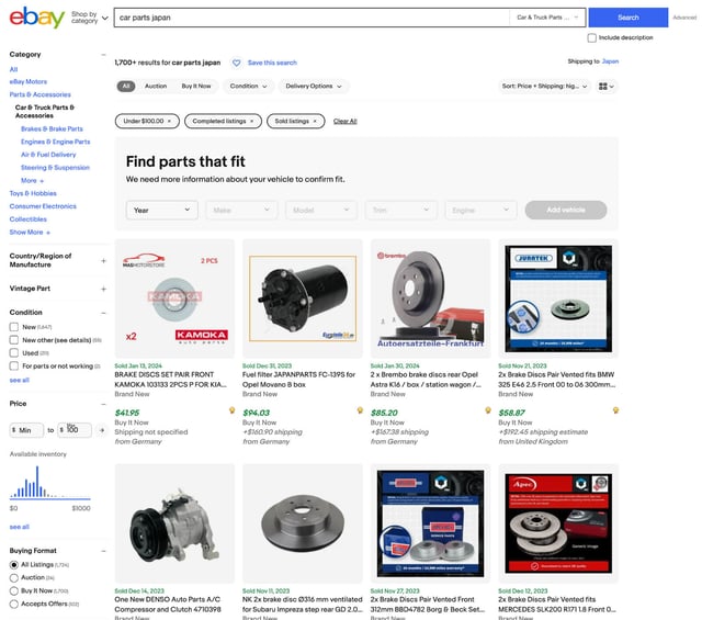 - 「Vintage Car/Bike Parts(ヴィンテージ 自動車/バイク パーツ)」や、「Aftermarket Parts」に「Japanese」や「JDM」を追加して検索語を作る