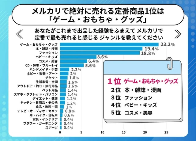 独自アンケートの結果も、メルカリで公開された結果と同様に、「ゲーム・おもちゃ・グッズ」と「ファッション」が上位にランクインしていました。