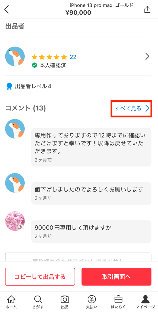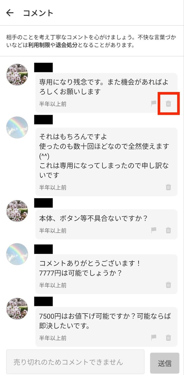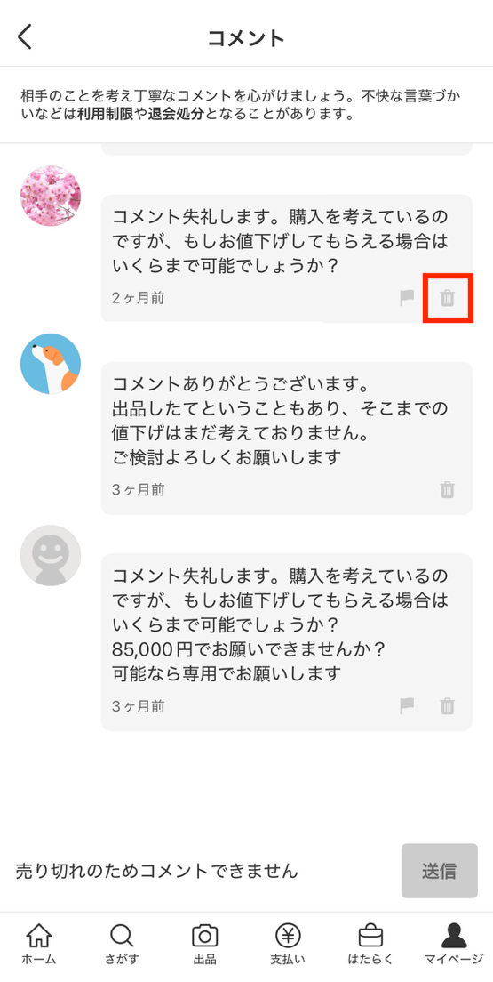 価格交渉のコメントを残しておくと、他の購入希望者がさらに値下げを求めたり、希望の価格で売れなかったりする可能性があります。そのため、やり取りが終わった購入者からの価格交渉コメントは、削除を検討しましょう。