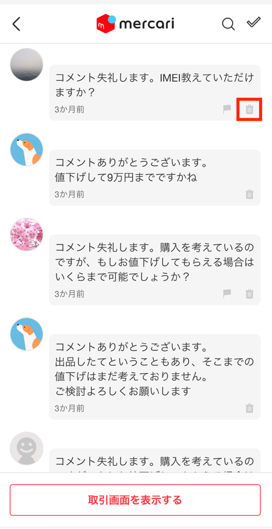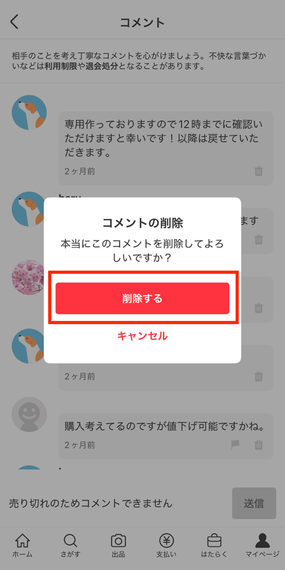 メルカリのコメント削除方法