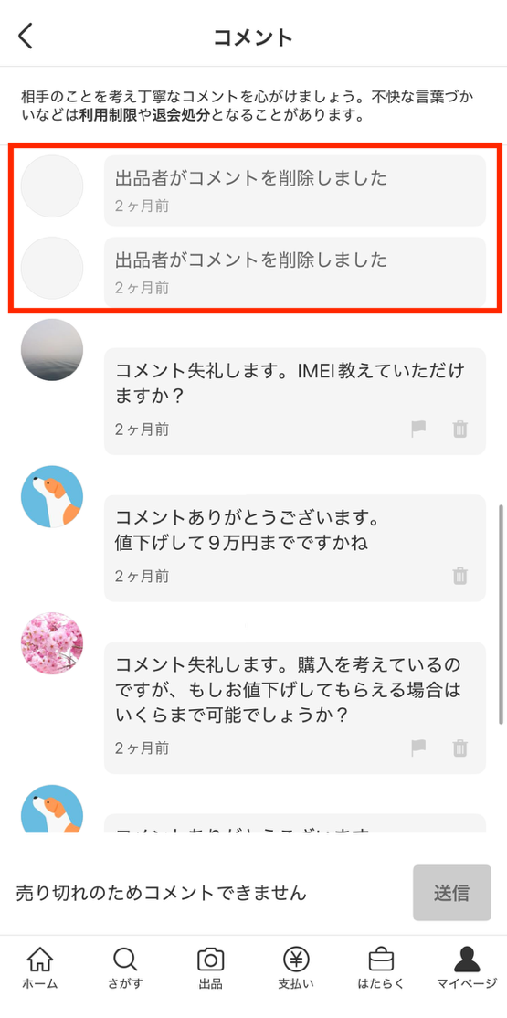 メルカリでコメントが削除された場合の表示