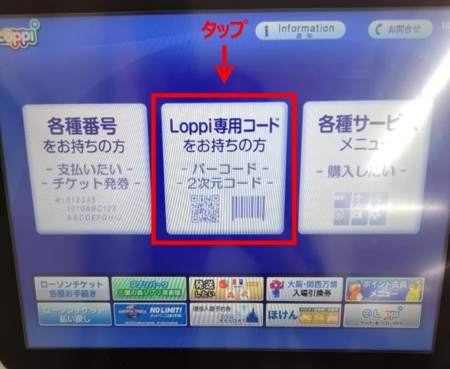 ローソンのLoppiに到着しました。まずは、画面中央にある「Loppi専用コードをお持ちの方」をタップします。