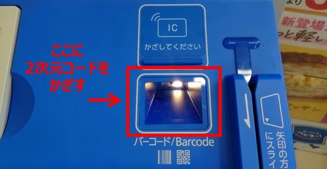 Loppiのバーコード読み取り機は、画面の手前にある、このピカピカしたところです。先ほど表示させた2次元コードをかざします。