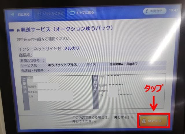 発送内容が表示されたら、確認して「発行する」をタップします。