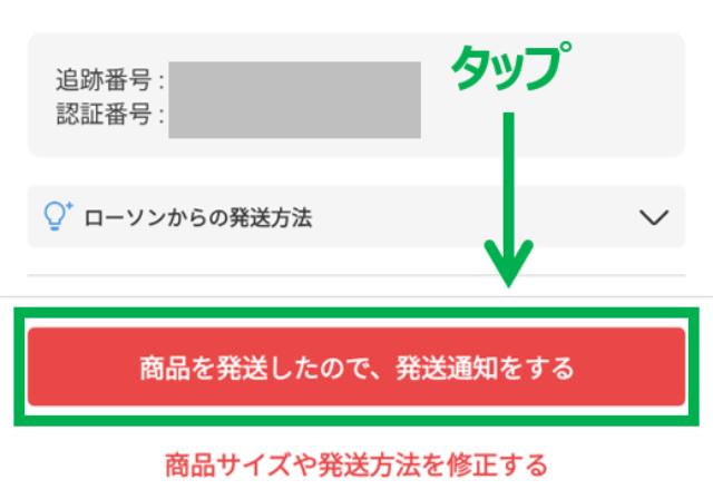 ローソンを出たら、メルカリの取引画面で発送通知をします。「商品を発送したので、発送通知をする」をタップします。