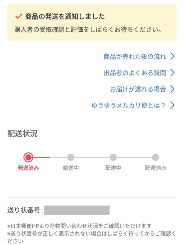 その後、しばらくすると「商品の発送を通知しました」の表示になり、追跡ができるようになります。
