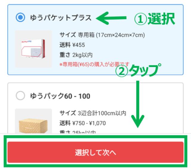 ゆうゆうメルカリ便の選択肢が出てくるので、「ゆうパケットプラス」を選んで「選択して次へ」をタップします。