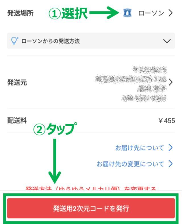 発送場所を「ローソン」に設定して、「発送用2次元コードを発行」をタップします。