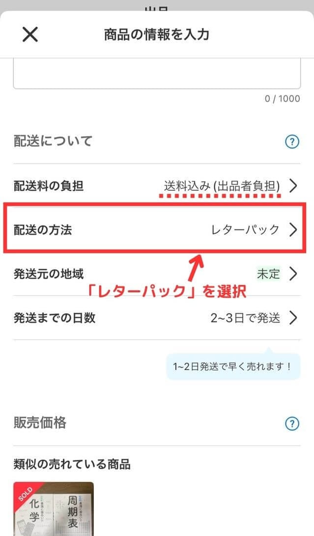 メルカリで出品した商品を「レターパック」で発送するには、出品登録をするときに発送方法で「レターパック」を指定しておく必要があります。